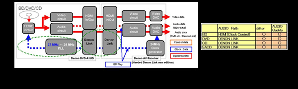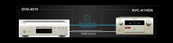 DENON LINK 第4代,与HDMI一起连接传送数码音频(包括CD、 DVD-Audio、 Super Audio CD 和蓝光高清音频信号)时,播放机是只会采用A/V扩音机里管理数/模转换器的主时钟频率,共同分享同一个主時钟的优点是为了使数码音频传送的数码基失真(jitter)尽量減少,结果可以在重播高质量的声音同时得到更具空间感和更清淅的音像。
